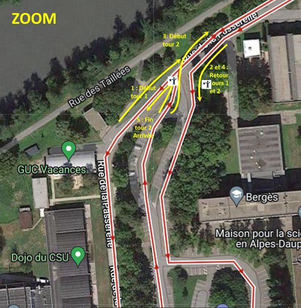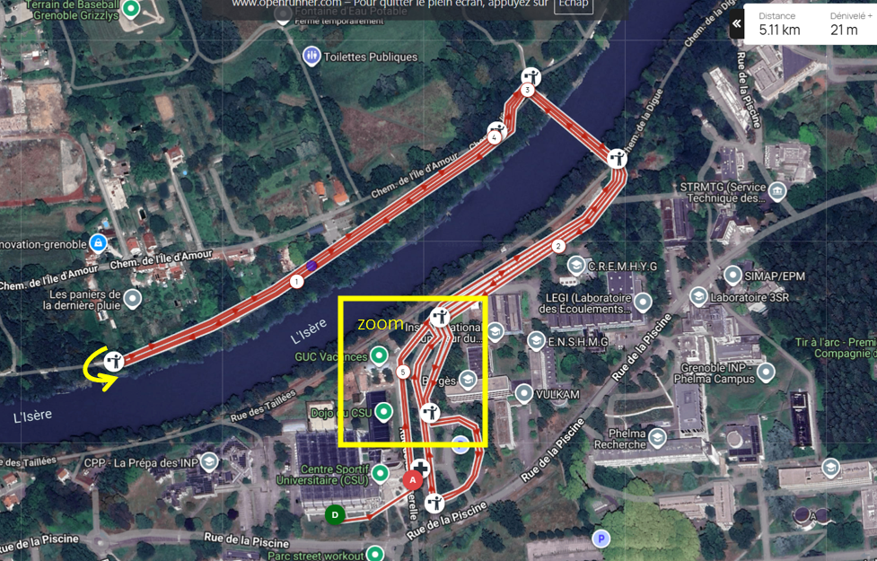 2 boucles pour un parcours total de 5km, avec, à mi-distance, un passage le parking de la piscine, pour refaire le plein d’encouragements.